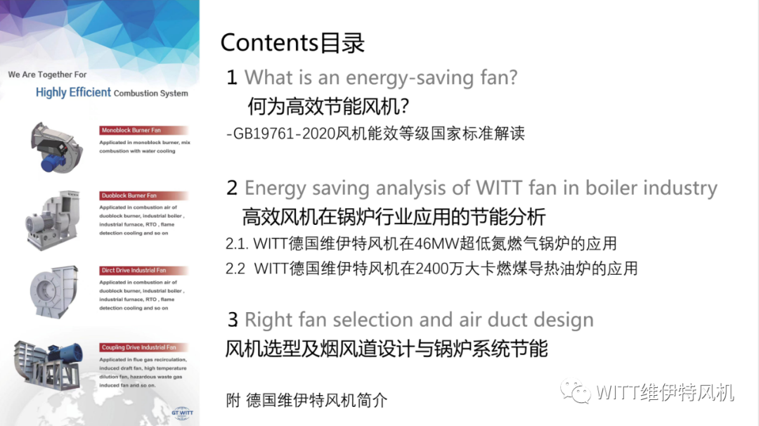 本届论坛围绕构建“产、学、研、用”协同创新体系,以锅炉节能降碳技术,绿色低碳高质量发展等热点内容进行研讨,分析“十四五”作为碳达峰的关键期、窗口期,重点实施减污降碳行动、推进绿色制造、构建清洁低碳能源体系面临的机遇和挑战。风机作为锅炉系统的耗能大户,采用高效节能风机不仅有利于于国家碳减排的大目标,也实实在在有利于用户降低耗电量从而降低运营成本。由德国WITT公司投资的维伊特风机(无锡)有限公司将德国的高效离心风机技术引进中国,结合中国的本土制造,降低了生产制造成本,给用户带来高性价比的节能产品,本次论坛维伊特风机通过应用于“雄安高铁站3台46MW超低氮燃气锅炉”和"浙江恒逸集团5台2400万大卡燃煤导热油炉“的案例分析了维伊特风机给项目和用户带来的电耗节省和碳减排,用实实在在的数据展示了维伊特风机的节能效果。